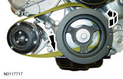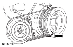 - Stage 3: Position the A/C compressor belt onto the A/C compressor pulley with the lower portion of the accessory drive belt ribs facing towards the front of the vehicle and above the oil pan as shown.