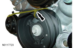 Position the A/C compressor belt onto the top of the crankshaft pulley and feed a tie strap with a minimum width of 3 mm (0.12 in) through the crankshaft pulley spokes, up and over the A/C compressor belt and tighten the tie strap.