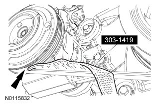Position the A/C compressor belt onto the top of the crankshaft pulley and feed a tie strap with a minimum width of 3 mm (0.12 in) through the crankshaft pulley spokes, up and over the A/C compressor belt and tighten the tie strap.