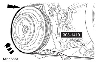 NOTICE: Under no circumstances should the A/C compressor belt, accessory drive belt, tensioner or pulleys be lubricated as potential damage to the belt material and tensioner damping mechanism will occur. Do not apply any fluids or belt dressing to the A/C compressor belt, accessory drive belt or pulleys.