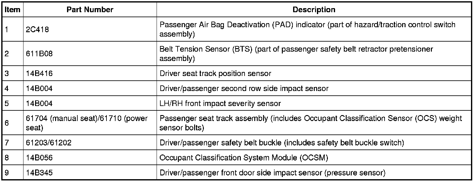 The serviceable air bag and safety belt pretensioner SRS components are shown in the following illustrations.