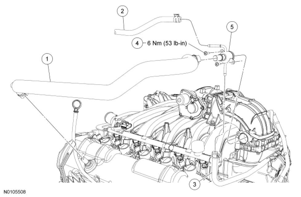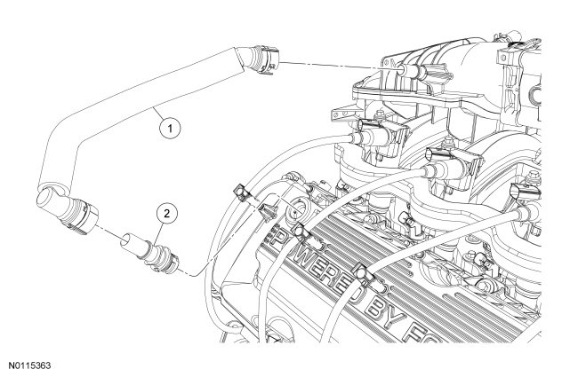 NOTE: Disconnect the quick connect couplings and remove the PCV tube. For additional information, refer to Fuel System - General Information - Gasoline and Diesel Quick Connect Coupling.