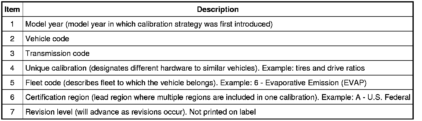 NOTE: Powertrain calibration information is limited to a maximum of 5 characters per line on the Vehicle Certification (VC) label. Because of this, calibration identification consisting of more than 5 characters will wrap to the second line on the VC label.