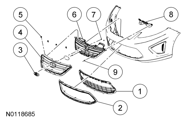 2. Disconnect the upper radiator grille reinforcement from the front bumper cover and remove the upper radiator grille and reinforcement as an assembly.