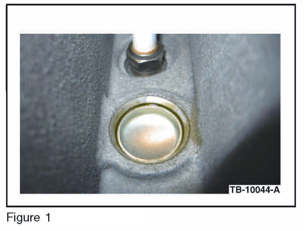 9. Install the new cup plug(s) using a suitable tool such as Snap-On(R) 2009 FPI Kit, Freeze Plug Installer or equivalent. Installation depth should be between the top of, or up to 1/32" (1 mm) below bottom cut in the flange of the cup plug hole. (Figure 1)