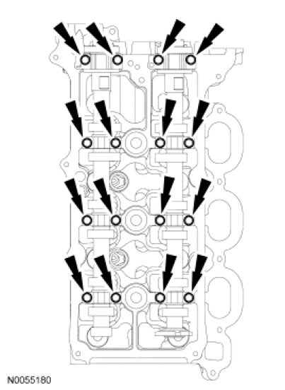 112. NOTE: The VCT bolt and the exhaust camshaft bolt must be discarded and new ones installed. However, the exhaust camshaft washer is reusable.