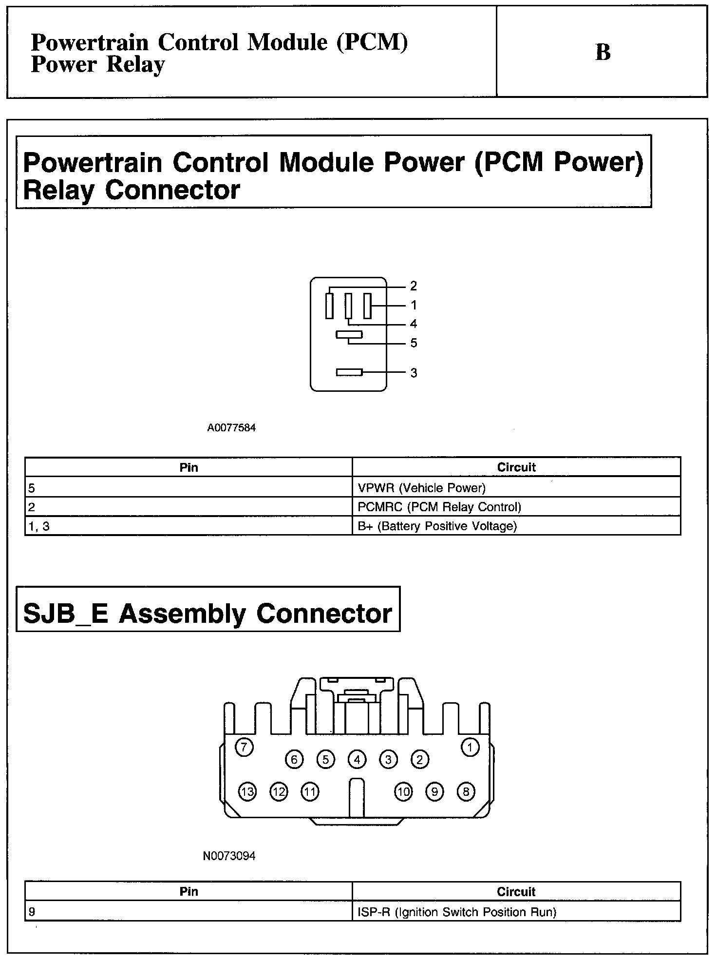 Powertrain Control Module Power (PCM Power) Relay Connector And SJB_E Assembly Connector: