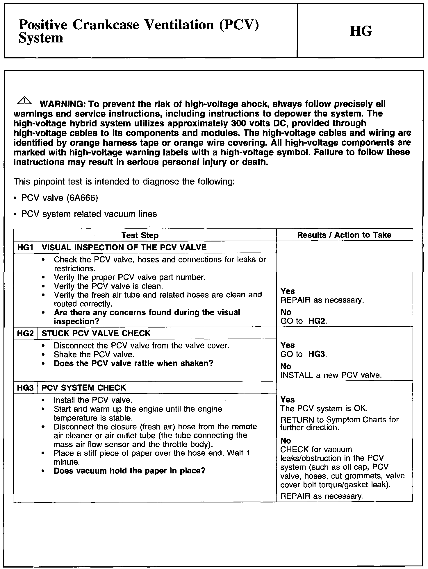 Test HG: Positive Crankcase Ventilation (PCV) System