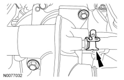 - Attach the block heater wiring harness retainer to the power steering reservoir hose and the PSP hose.