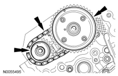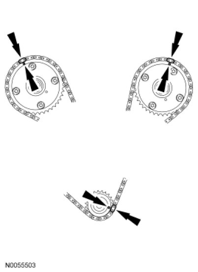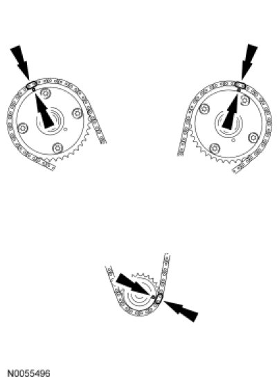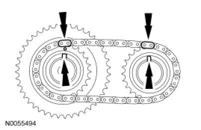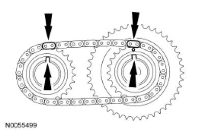 14. Install the primary timing chain with the colored links aligned with the timing marks on the VCT assemblies and the crankshaft sprocket.