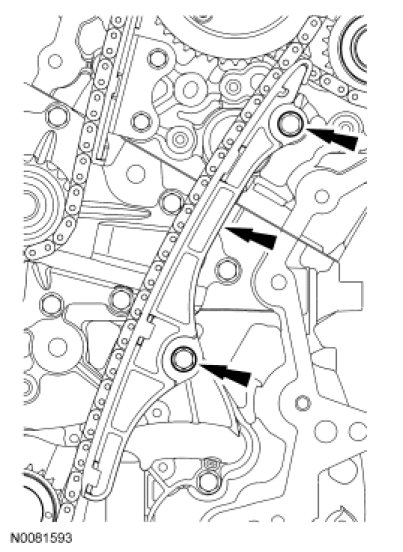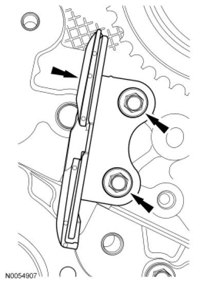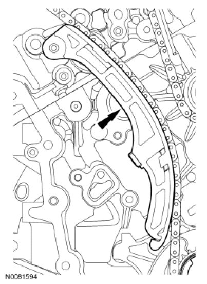 NOTE: The engine comes equipped with either a composite RH timing chain guide requiring the timing chain to ride on the outer side of the guide or a stamped steel RH timing chain guide requiring the timing chain to ride on the inner side of the guide. All replacement RH timing chain guides will be the stamped steel design.