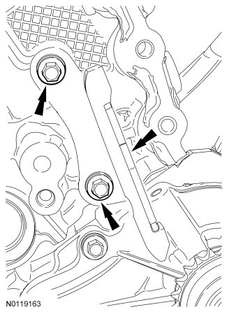 16. Install the lower LH primary timing chain guide and the 2 bolts.