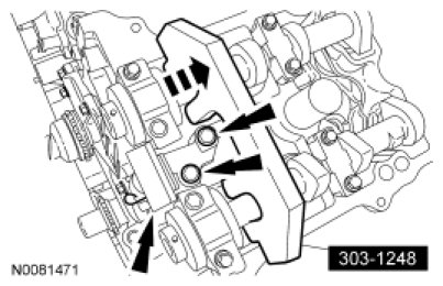 8. NOTE: It is necessary to tilt the Camshaft Holding Tool toward the rear of the engine to access the rearmost secondary timing chain tensioner bolt.