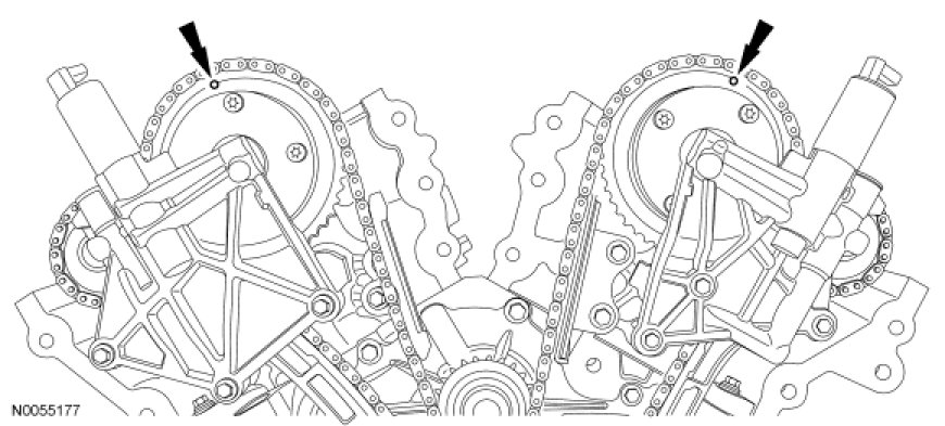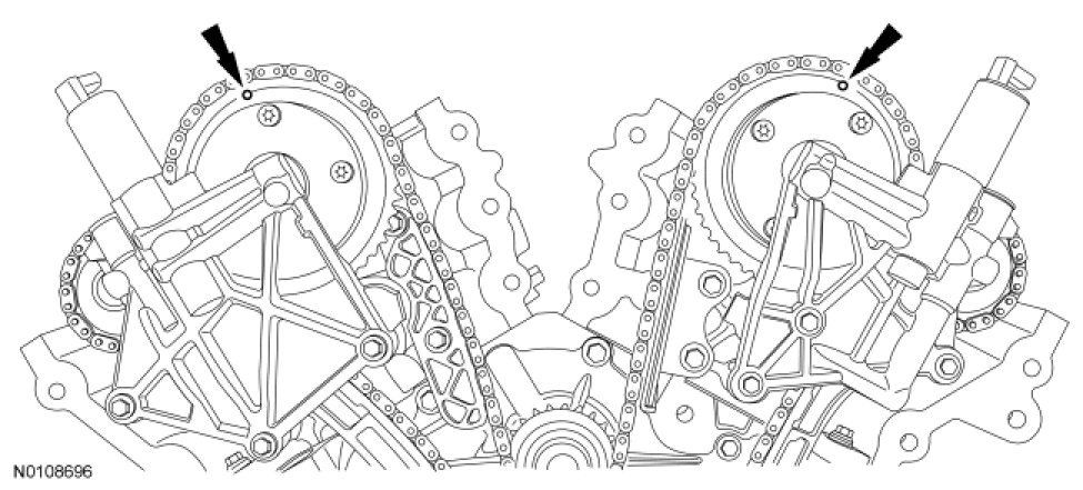 3. Rotate the crankshaft clockwise and align the timing marks on the Variable Camshaft Timing (VCT) assemblies as shown.