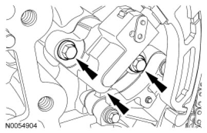 18. NOTE: The VCT bolt and the exhaust camshaft bolt must be discarded and new ones installed. However, the exhaust camshaft washer is reusable.