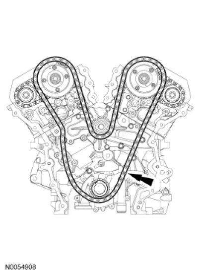 NOTE: The engine comes equipped with either a composite RH timing chain guide requiring the timing chain to ride on the outer side of the guide or a stamped steel RH timing chain guide requiring the timing chain to ride on the inner side of the guide. All replacement RH timing chain guides will be the stamped steel design.