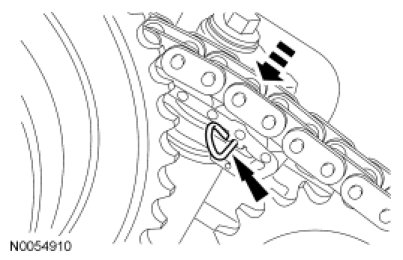 14. Compress the LH secondary timing chain tensioner and install a suitable lockpin to retain the tensioner in the collapsed position.
