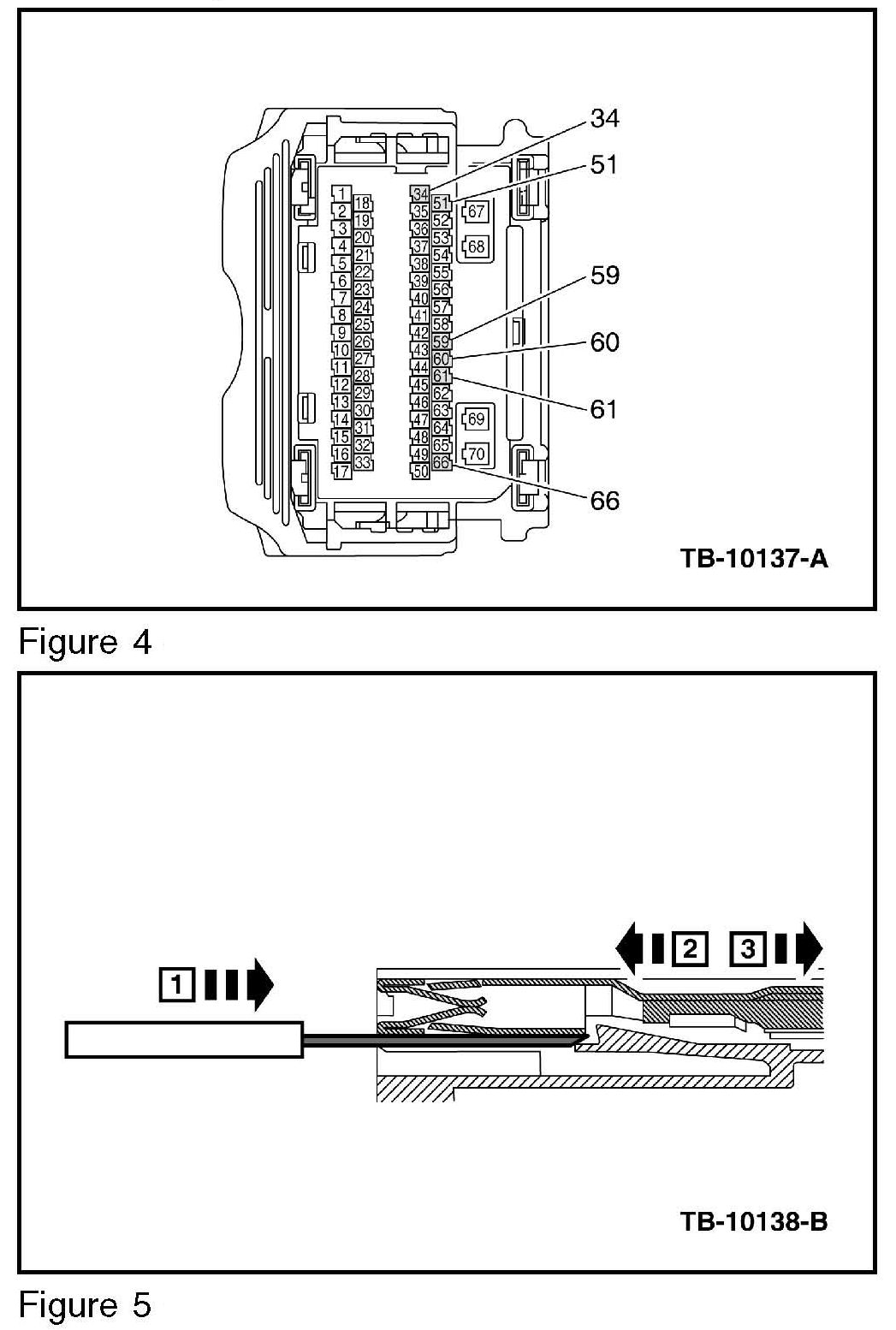 9. Using a wire terminal release tool (OTC 7740 or similar), remove female terminal pin numbers 34, 51, 59, 60, 61 and 66 from C175E. (Figures 4 and 5)