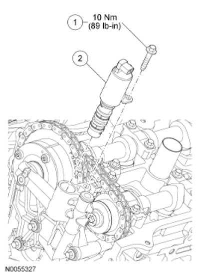 Remove the bolt and the Variable Camshaft Timing (VCT) oil control solenoid.
