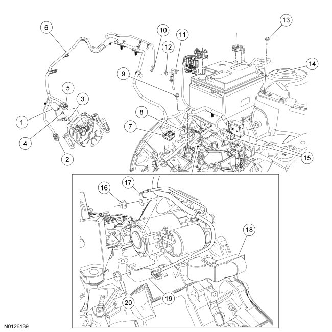 16. Remove the nut and position the battery cable starter motor B+ terminal aside.