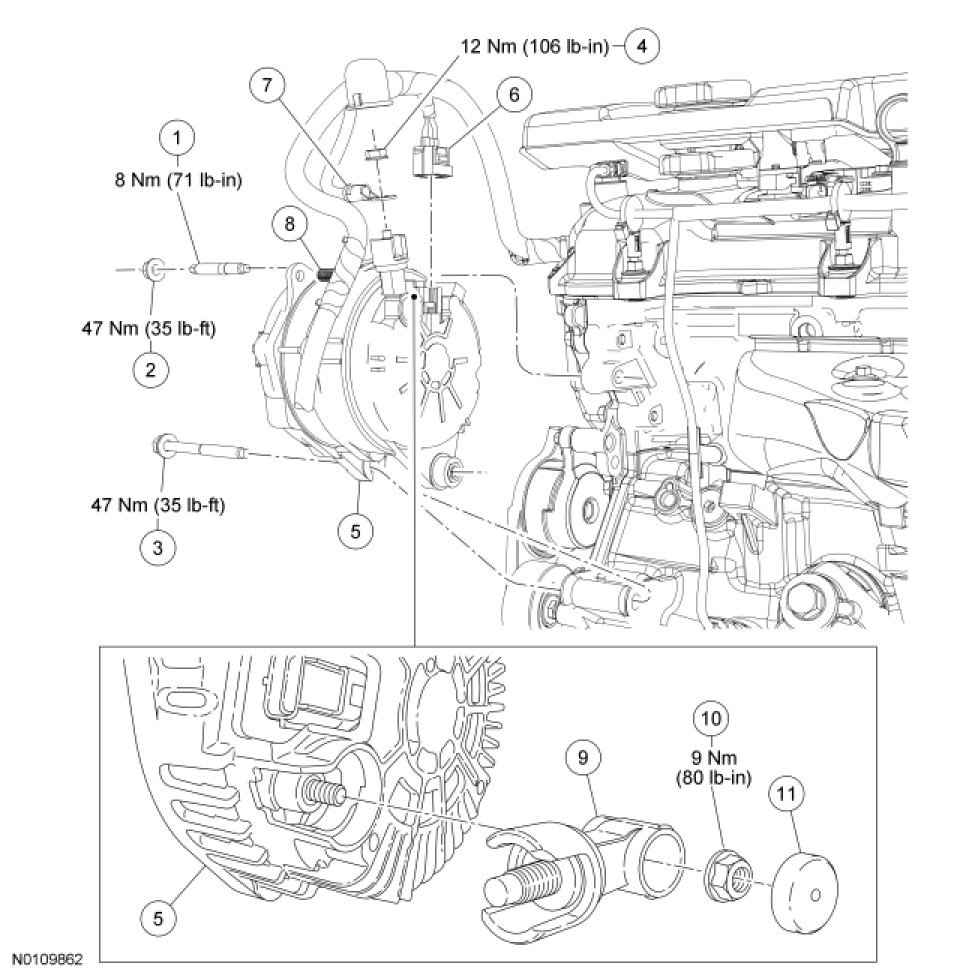 3. Position the generator protective cover aside, remove the nut and position the generator B+ terminal aside.