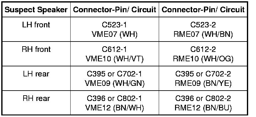 - Measure the AC voltage between the suspect speaker pin 1 and pin 2, harness side as follows: