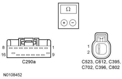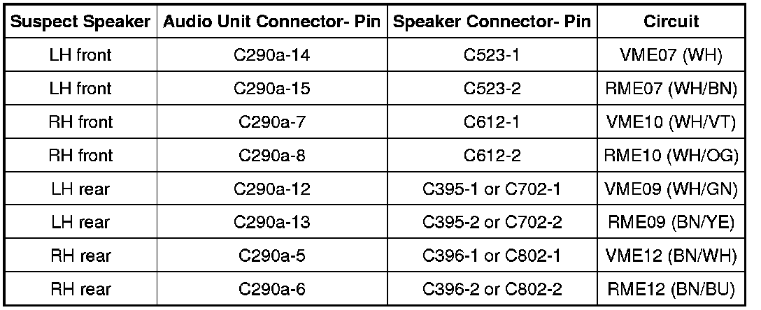 - Measure the resistance between the audio unit, harness side and the suspect speaker, harness side; and between the audio unit, harness side and ground as follows: