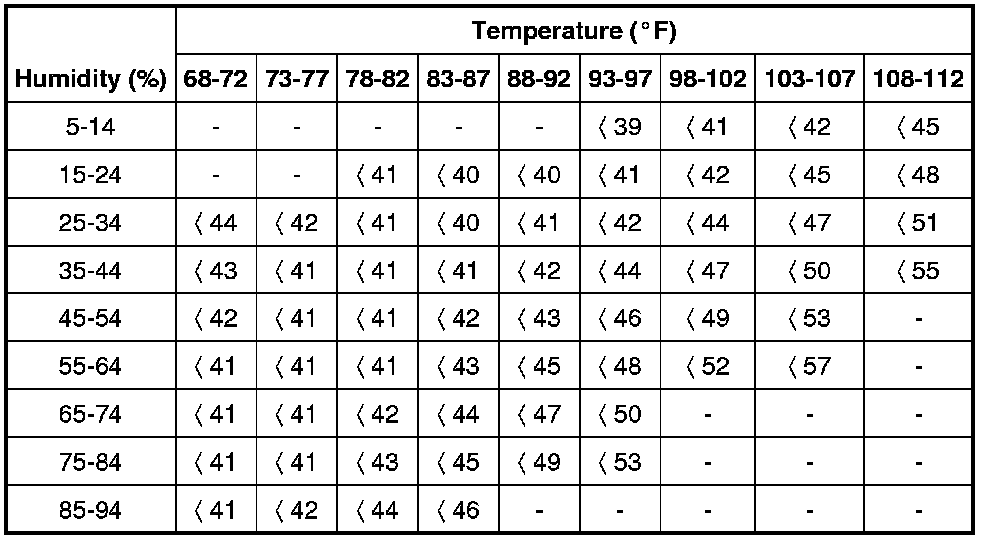 7. Compare the average center vent temperature to the A/C Performance Chart for the ambient conditions at the time of testing.