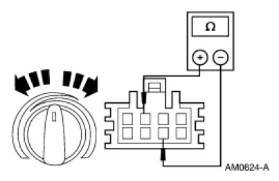 - Measure the resistance between temperature blend door actuator C289-3, circuit VH450 (BN/WH), harness side and C289-6, circuit CH449 (BU/OG), harness side while rotating the temperature control potentiometer from full WARM to full COOL.