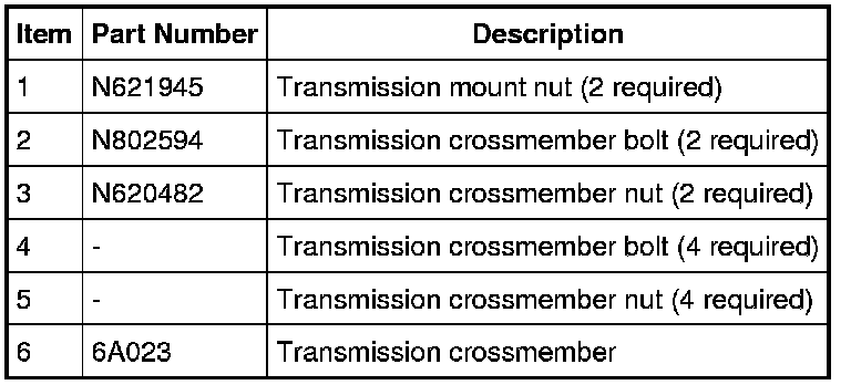 4. NOTE: Four-Wheel Drive (4WD) transmission support crossmember shown, Rear Wheel Drive (RWD) transmission support crossmember similar.