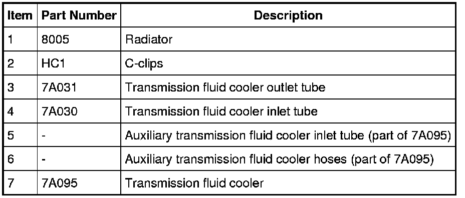 This vehicle with an automatic transmission is equipped with a transmission fluid cooler integral to the radiator and cannot be repaired separately. The integral transmission fluid cooler transfers heat from the transmission fluid to the engine coolant. The auxiliary transmission fluid cooler transfers heat from the transmission fluid to outside air.