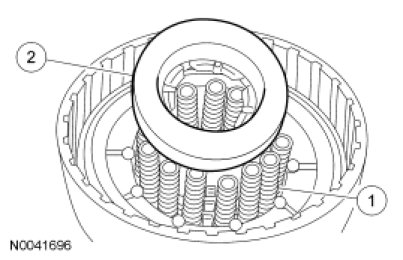 3. WARNING: While removing or installing the retaining ring, slowly release tool pressure on clutch piston springs. Failure to follow this instruction may cause the assembly to separate forcefully, resulting in serious personal injury.