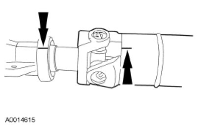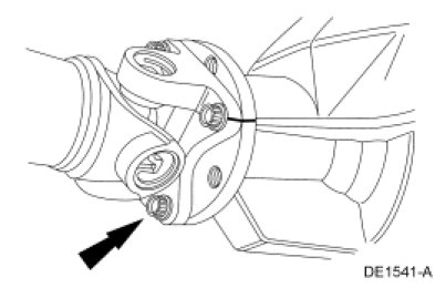 5. NOTE: The driveshaft flange fits tightly on the rear axle pinion flange pilot. Never hammer on the driveshaft or any of its components to disconnect the driveshaft flange from the pinion flange. Pry only in the area shown, with a suitable tool, to disconnect the driveshaft flange from the pinion flange.