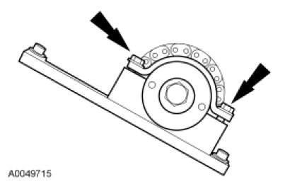 18. Install the Camshaft Sprocket Holding Tool and the Adapter for 303-564 on the front of the LH cylinder head and, if necessary, tighten the top 2 clamp bolts to 10 Nm (89 lb-in).