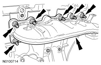 43. NOTICE: If the engine is repaired or replaced because of upper engine failure, typically including valve or piston damage, check the intake manifold for metal debris. If metal debris is found, install a new intake manifold. Failure to follow these instructions can result in engine damage.