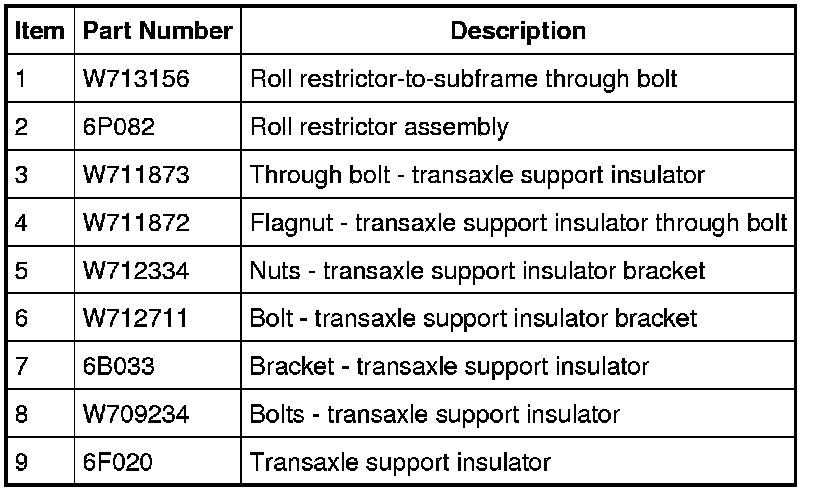 9. Position the roll restrictor in place and install the engine roll restrictor-to-subframe through bolt.