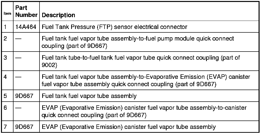 NOTE: The fuel vapor tube assembly is a 2 part assembly. One tube connects to the fuel tank and includes the fuel tank pressure sensor. Another tube connects to the Evaporative Emission (EVAP) canister. The 2 tubes are connected by a quick connect coupling.