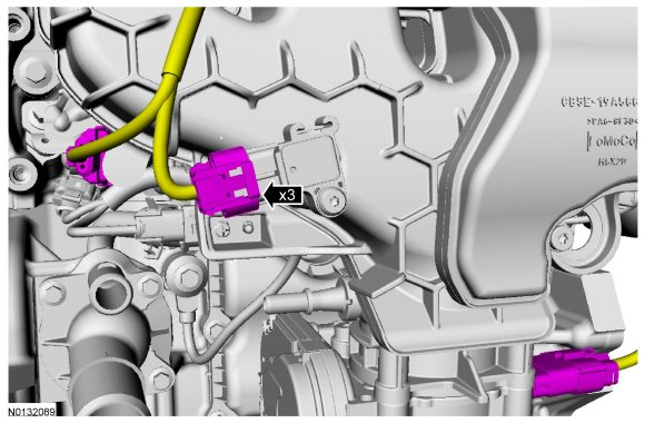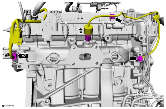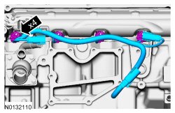 110. Install the fuel charge wiring harness and connect the 4 fuel injector electrical connectors.