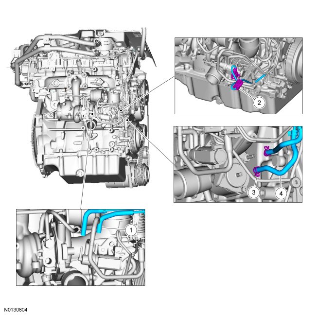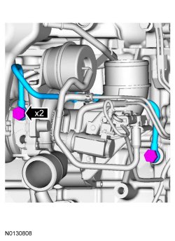 Install a new cylinder block oil to engine turbocharger pipe, new gaskets and the 2 bolts.