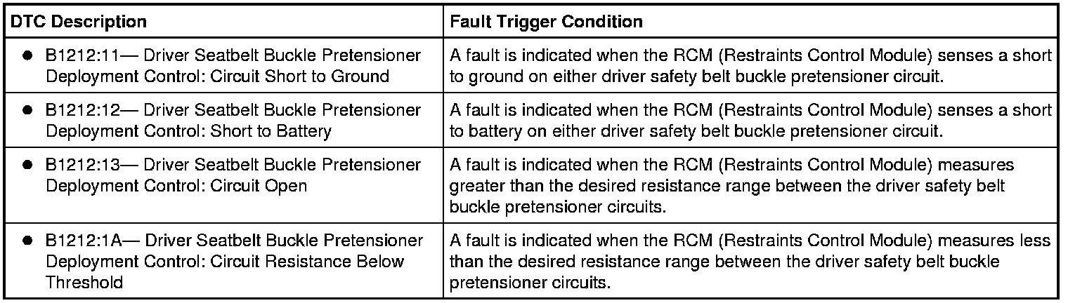 The Restraints Control Module (RCM) monitors driver safety belt buckle pretensioner and circuits for the following faults: