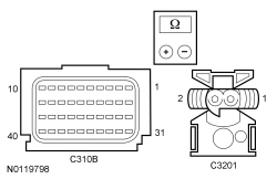 - Measure the resistance between RCM (Restraints Control Module) C310B, harness side and driver safety belt buckle pretensioner C3201, harness side using the following chart.