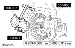 4. Turn the differential ring gear without turning the drive pinion gear. Record the Dial Indicator Gauge reading. The allowable backlash is mm (0.008 in) to 0.305 mm (0.012 in).