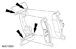1. Using specified brake parts cleaner, dry and inspect the brake caliper anchor plate. Apply equal amounts of the supplied yellow lubricant to the 4 brake pad contact points on the anchor plate as shown.