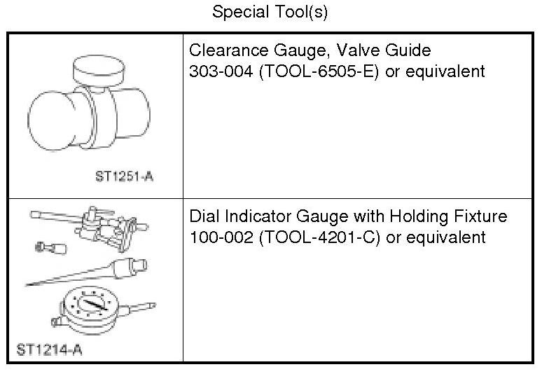 Install a Valve Guide Clearance Gauge on the valve stem and install a Dial Indicator Gauge with Holding Fixture. Lower the valve until the clearance gauge contacts the upper surface of the valve guide.