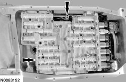 Slightly lift the mechatronic assembly and align the manual valve in the manual valve linkage and position the mechatronic in place.
