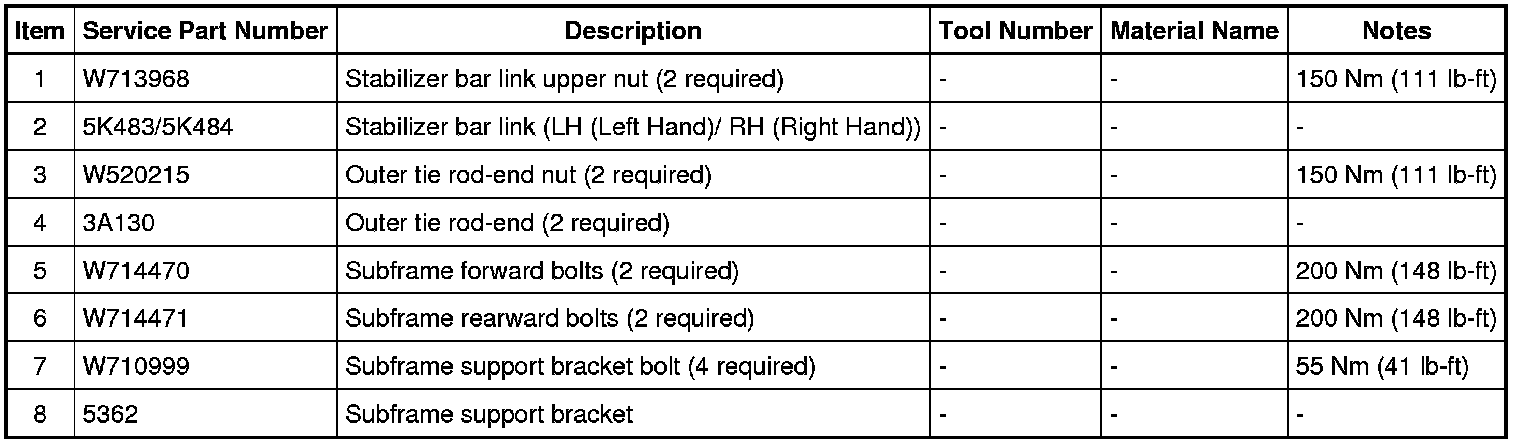- Tighten the subframe rearward and forward bolts to 200 Nm (148 lb-ft).