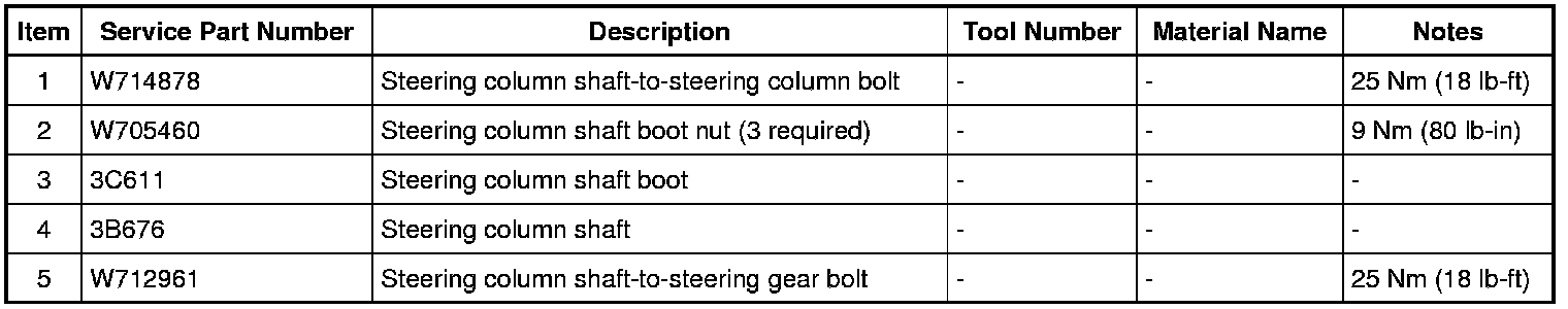 WARNING: Do not reuse steering column shaft bolts. This may result in fastener failure and steering column shaft detachment or loss of steering control. Failure to follow this instruction may result in serious injury to vehicle occupant(s).