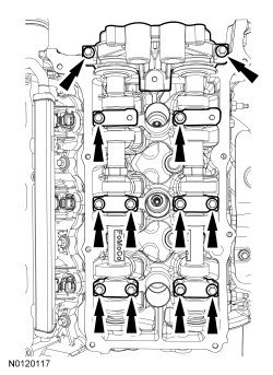 Remove the 12 bolts, 6 camshaft caps, mega cap and the RH camshafts.