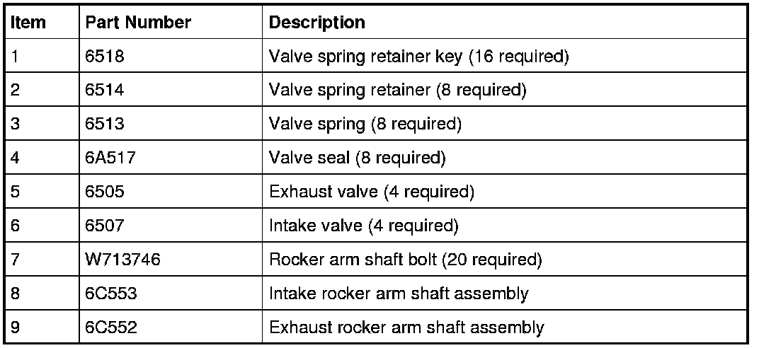 Rocker Arm Shafts, Valves, Valve Springs, Valve Spring Retainer Keys and Retainers
