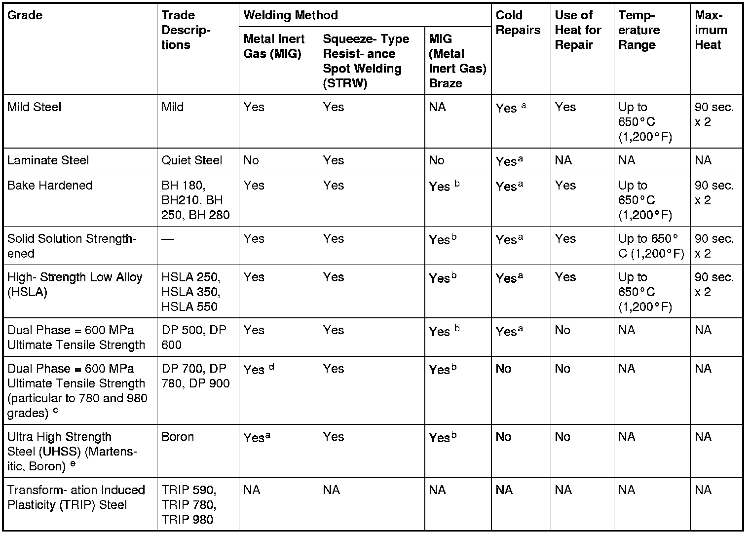 Ford Recommended Steel Repairability Matrix